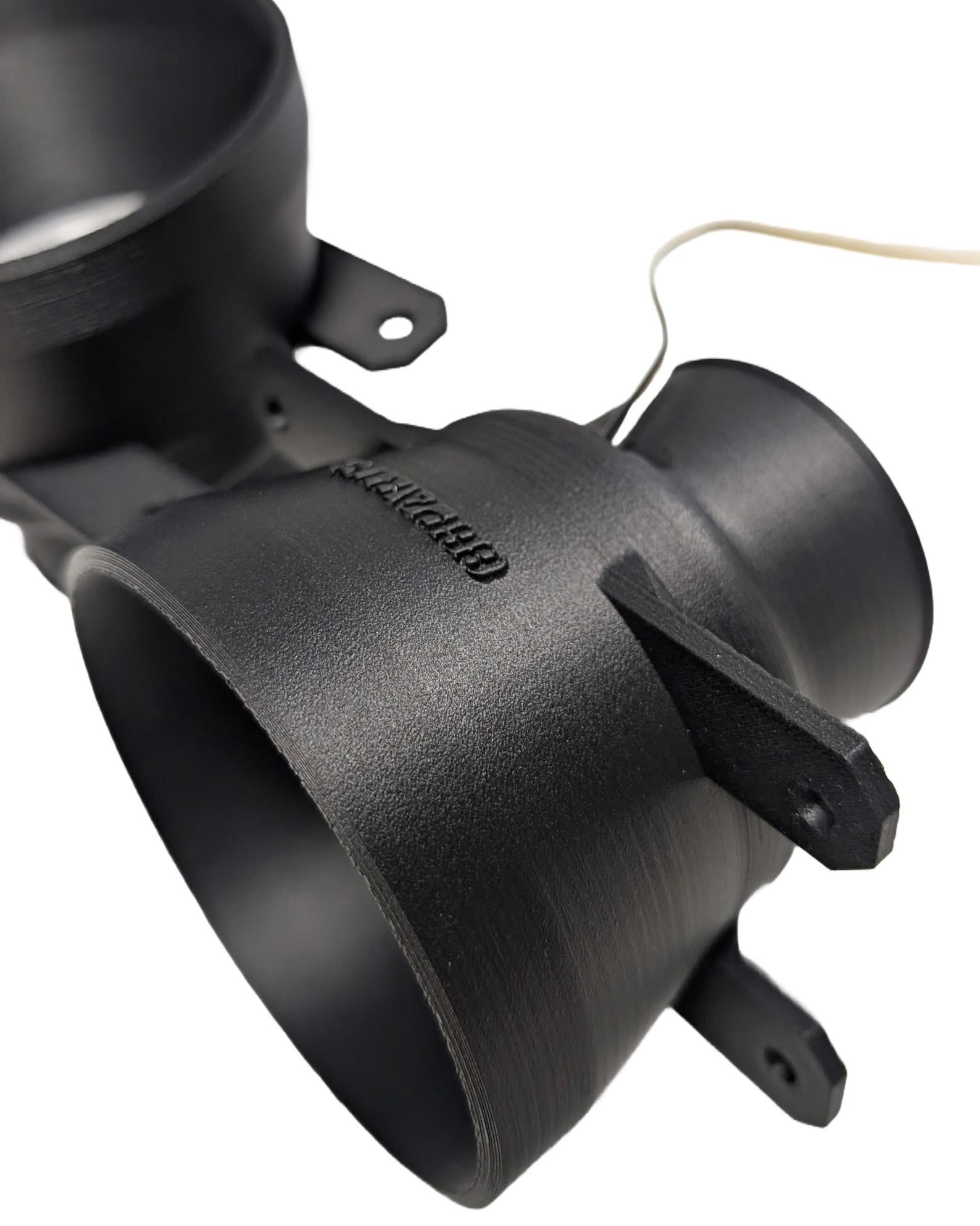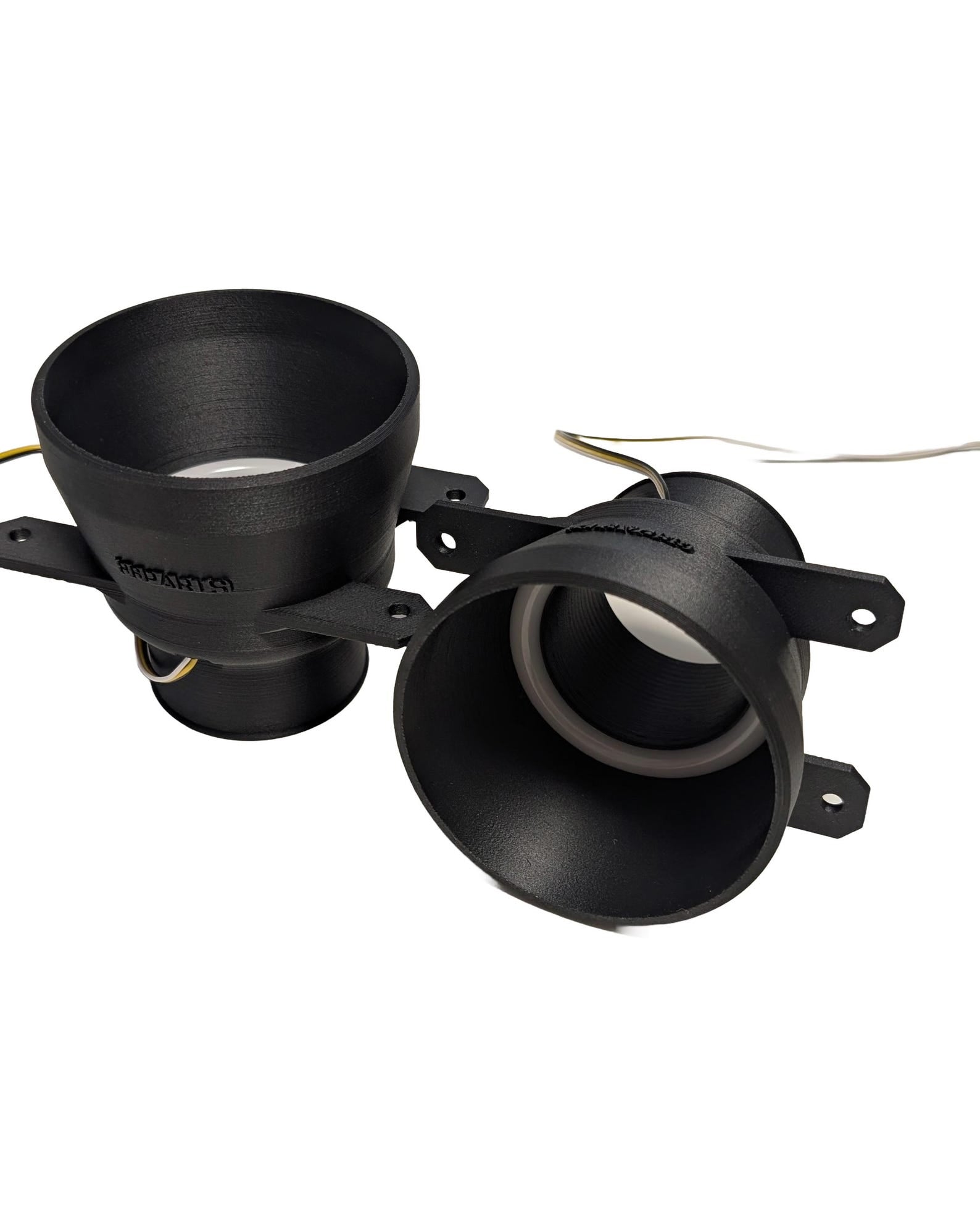 Diese 3D gedruckten Einsätze passen Plug & Play in die originale Stoßstange. Sie werden anstelle der OEM Nebelscheinwerfer an den vorhandenen Punkten verschraubt. Die Trichter haben einen Schlauchanschluss für 60mm Schläuche. Diese können nun auch optional mit einem weiß/orangen Halo bestellt werden, welches als Tagfahrlicht, Blinker oder zu anderen Zwecken genutzt werden kann. Die Trichter werden mit Plug-and-Play Stecker für den Nebelscheinwerfer geliefert, bei denen die Halos weiß leuchten. Das orange Licht kann frei angeschlossen werden.